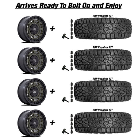 • (4) Mounted and balanced Tires. Your Choice of BFGoodrich All Terrain T/A K02 or RBP Repulsor R/T 37x12.5R17