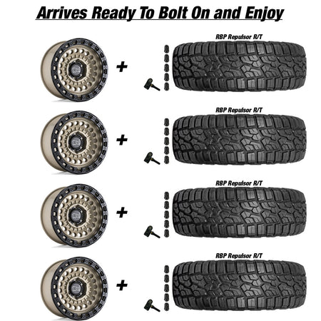 • (4) Mounted and balanced Tires. Your Choice of BFGoodrich All Terrain T/A K02 or RBP Repulsor R/T 37x12.5R17