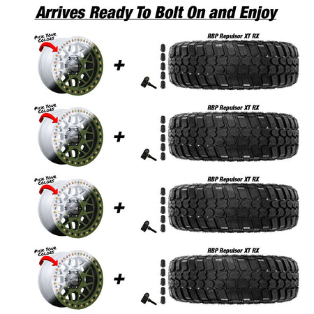 • (4) Mounted and balanced Tires. Your Choice of BFGoodrich All Terrain T/A K02 or RBP Repulsor X/T RX Tires (35x12.5/17)